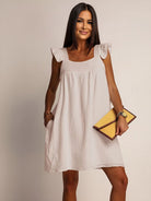 Cette élégante robe en gaze de coton, confectionnée en Italie, présente une encolure carrée flatteuse et de charmantes bretelles à volants. Conçue en taille unique, du 36 au 42, elle offre une coupe confortable et polyvalente. Idéale pour les journées chaudes, sa matière légère assure une respirabilité optimale tout en ajoutant une touche de style décontractée à votre garde-robe.