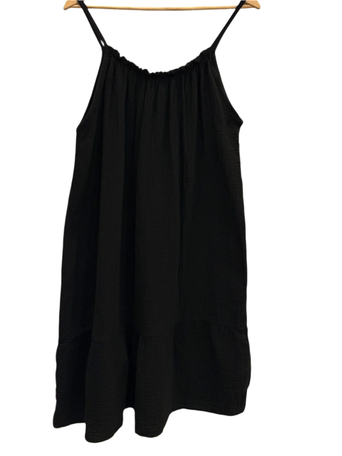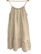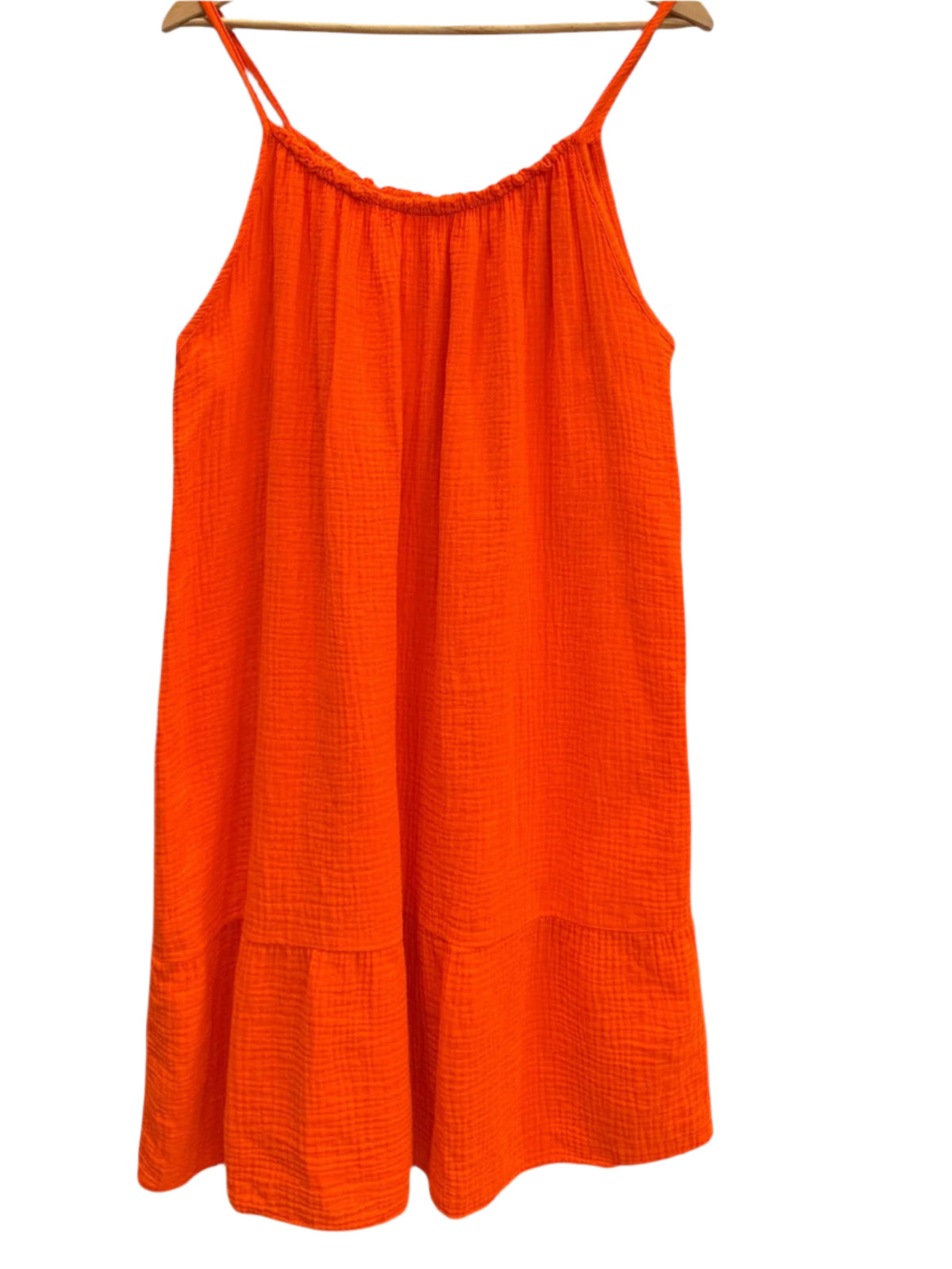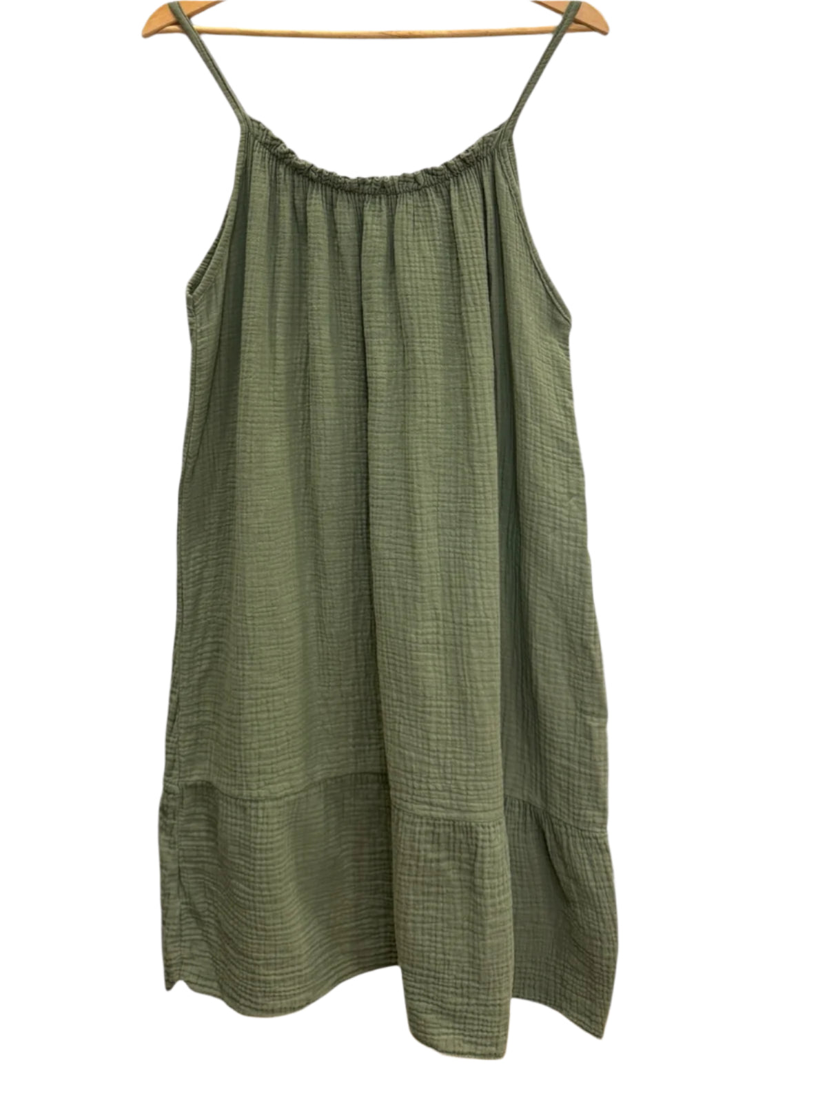 Cette robe à bretelles en gaze de coton 100 % italienne offre un confort respirant et un style décontracté, idéale pour les journées chaudes. Conçue pour les tailles 38 à 44, elle est idéale pour votre garde-robe estivale, alliant élégance et fraîcheur pour un confort optimal tout au long de la journée.