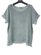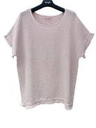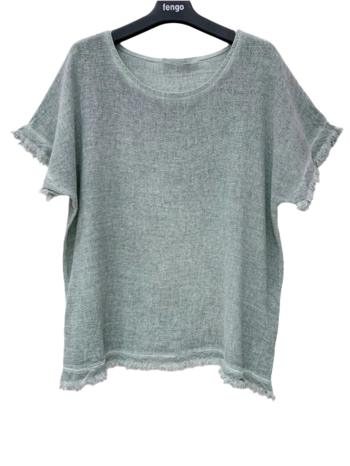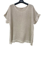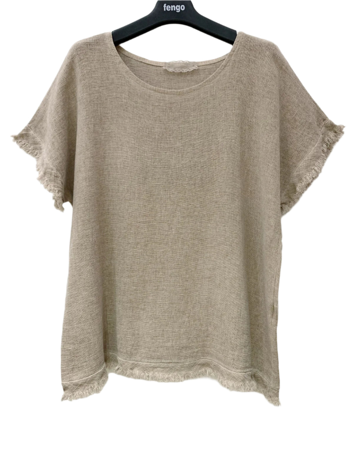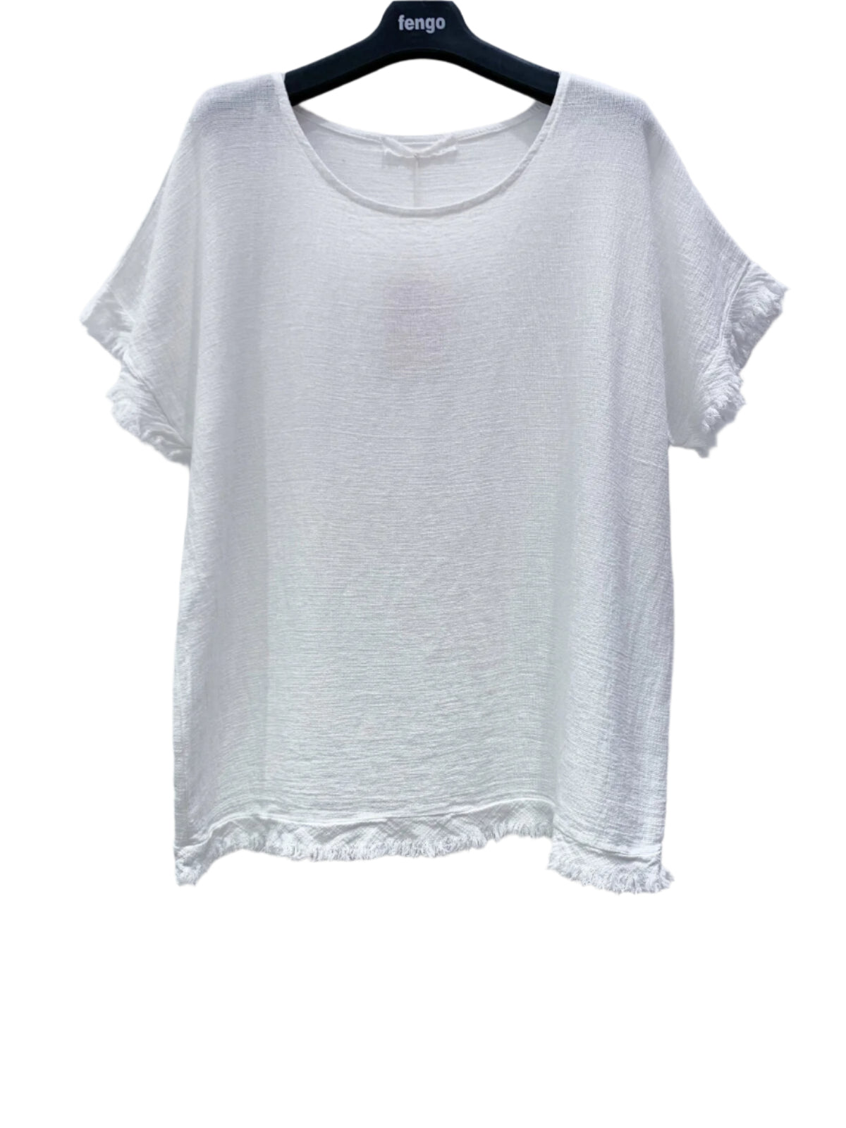 Ce haut style t-shirt de fabrication italienne allie le confort naturel d'un mélange de lin et de coton à des franges élégantes pour un look unique. Son col rond et sa taille unique conviennent parfaitement aux tailles 40 à 44 (UK 12-16), ce qui en fait un ajout polyvalent à votre garde-robe. Idéal pour une élégance naturelle et une sensation de respirabilité tout au long de la journée.