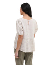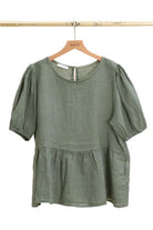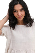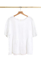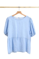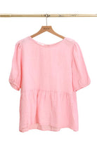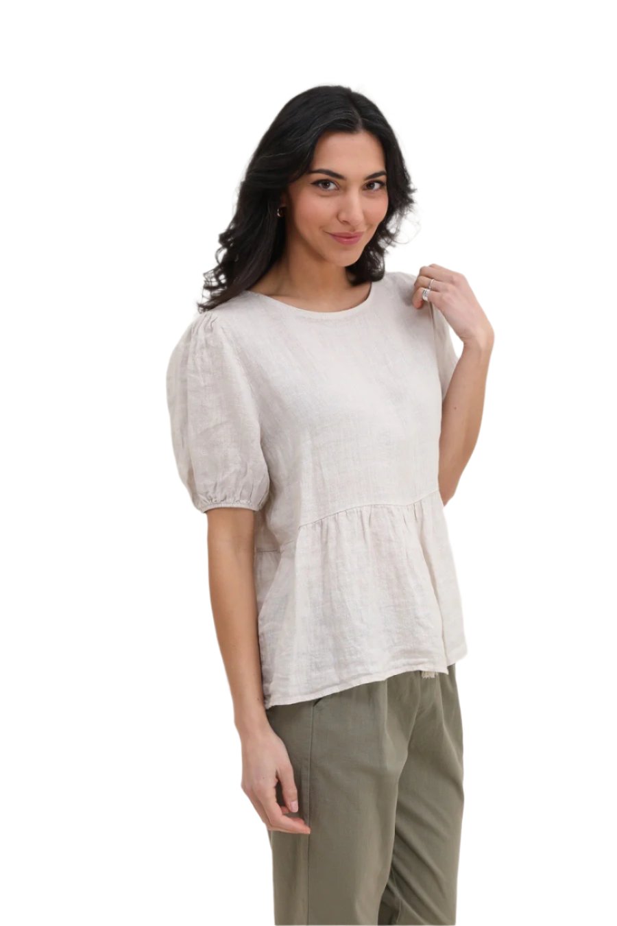 Haut en lin à manches courtes et volants, fabriqué en Italie. Conçu pour les tailles 36 à 42 (8 à 14), ce haut présente un col rond, des manches courtes et une fermeture à un bouton dans le dos. 100 % lin, il allie respirabilité et confort luxueux.