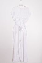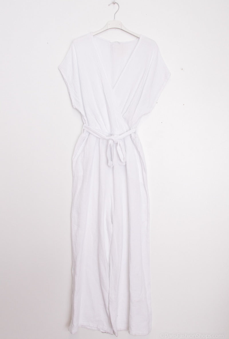 Confectionnée en gaze 100 % coton, cette combinaison est douce et respirante, idéale en toute saison. Ses manches courtes et son décolleté en V croisé flattent la silhouette, tandis que sa taille élastiquée avec ceinture à nouer assure un ajustement parfait. Ses poches avant pratiques lui confèrent une touche pratique et élégante.