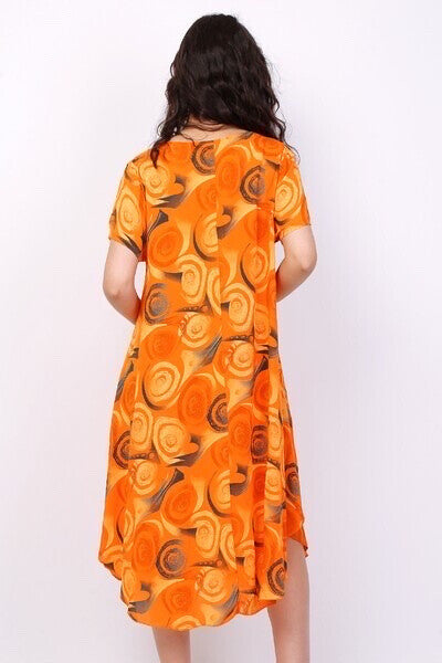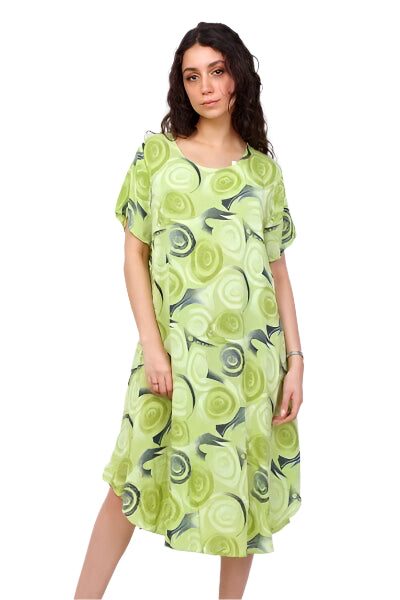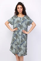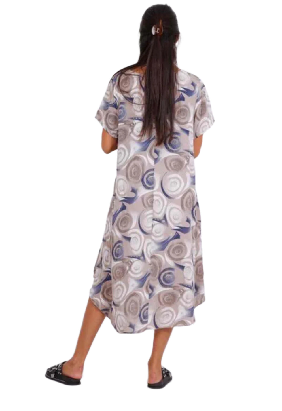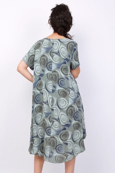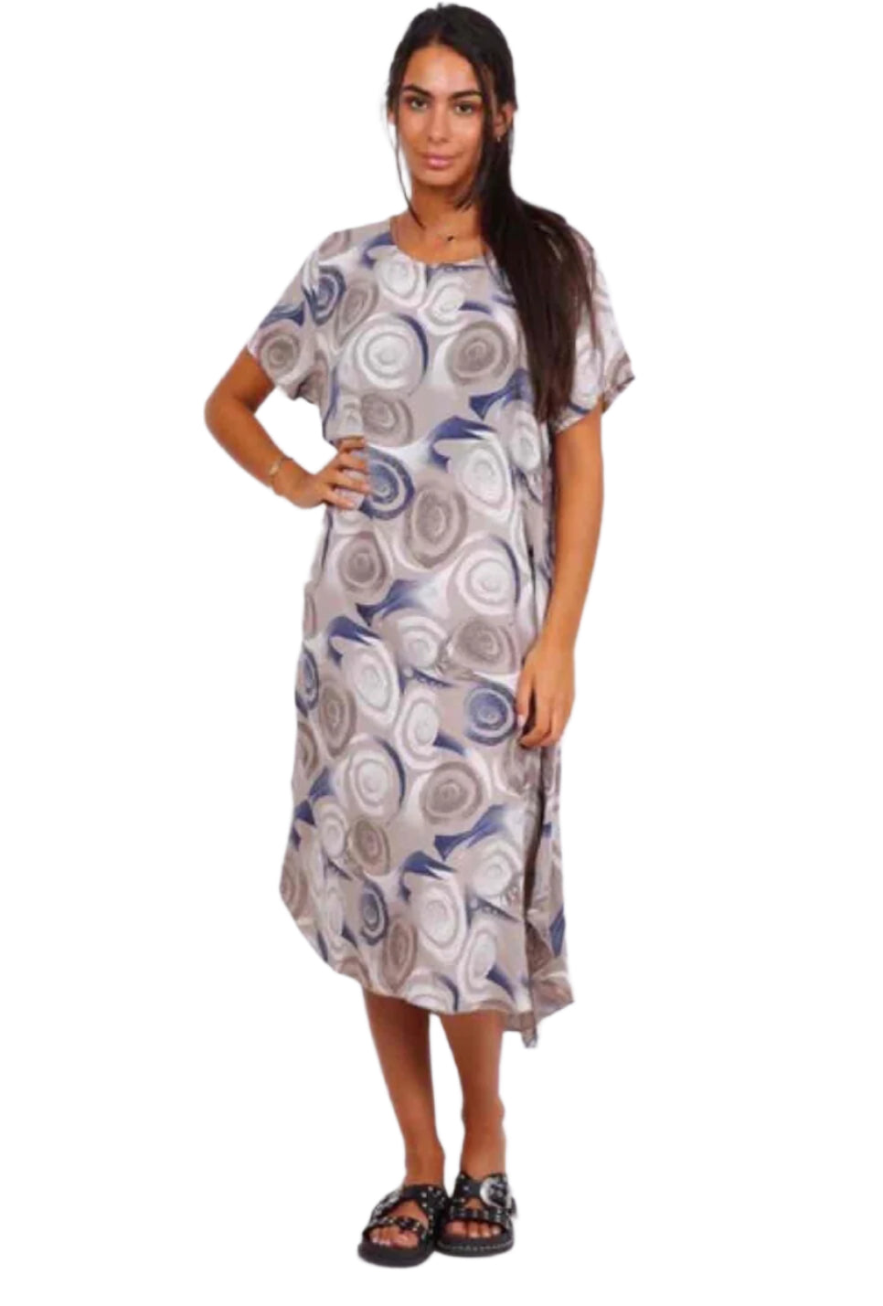Cette élégante robe imprimée présente un ourlet flatteur, un col rond et des manches courtes pour un look chic et décontracté. Confectionnée dans un mélange confortable de 95 % coton et 5 % élasthanne, elle offre respirabilité et légère élasticité. Fabriquée en Italie, cette taille unique convient aux tailles 38 à 48 (UK 10-20), alliant élégance et polyvalence en toute occasion. Fabriquée en Italie.