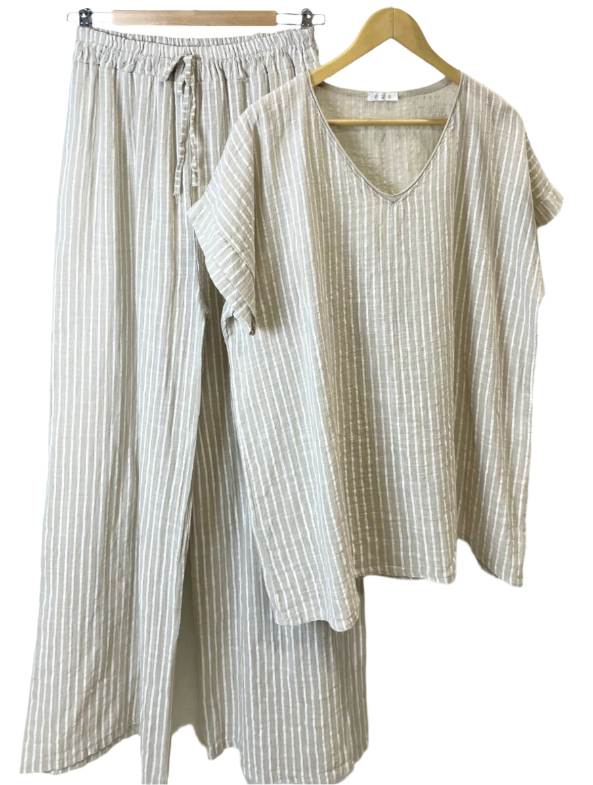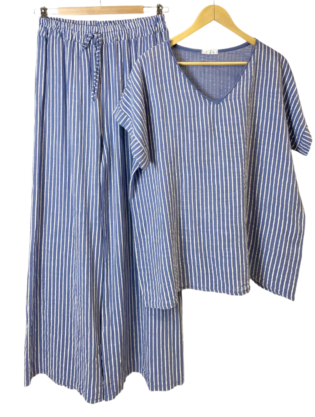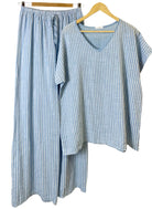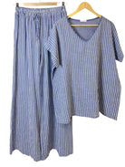 Adoptez une allure chic et décontractée avec notre pantalon rayé en coton à taille élastiquée ! Fabriqué en Italie en 100 % coton, ce pantalon offre confort et style pour un port facile. Complétez votre look avec notre haut à manches courtes et col V assorti . Taille unique pour les tailles 40-42 (UK 12-14).