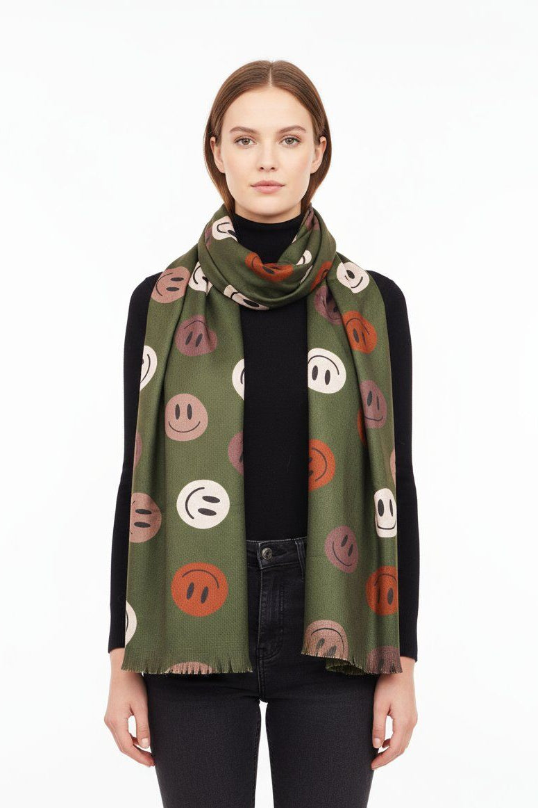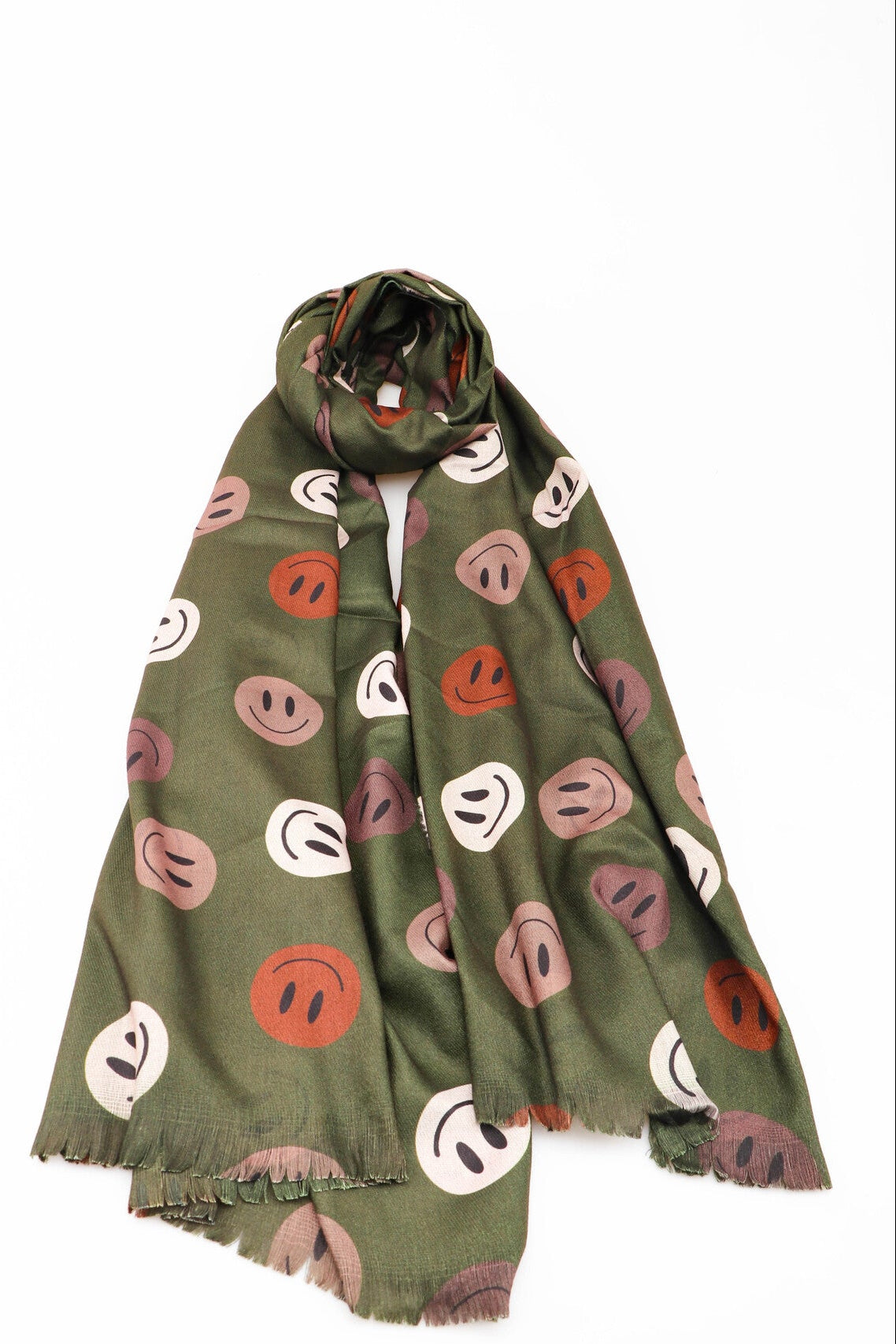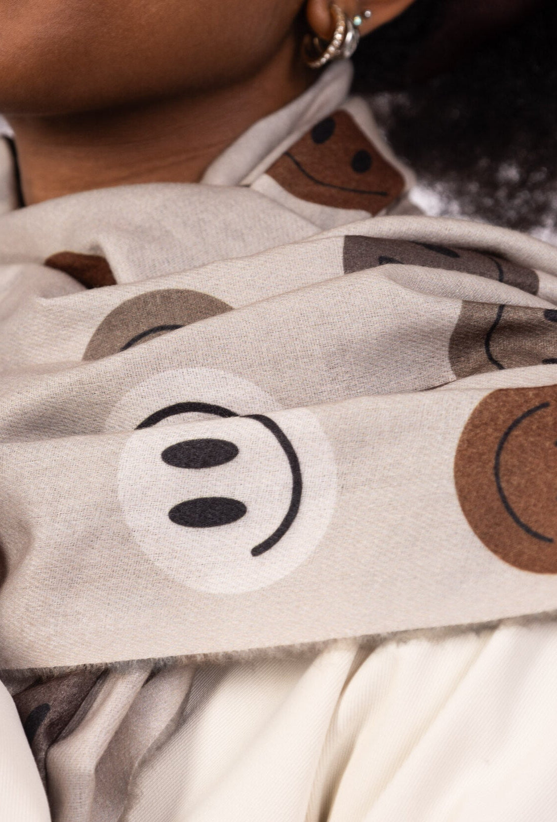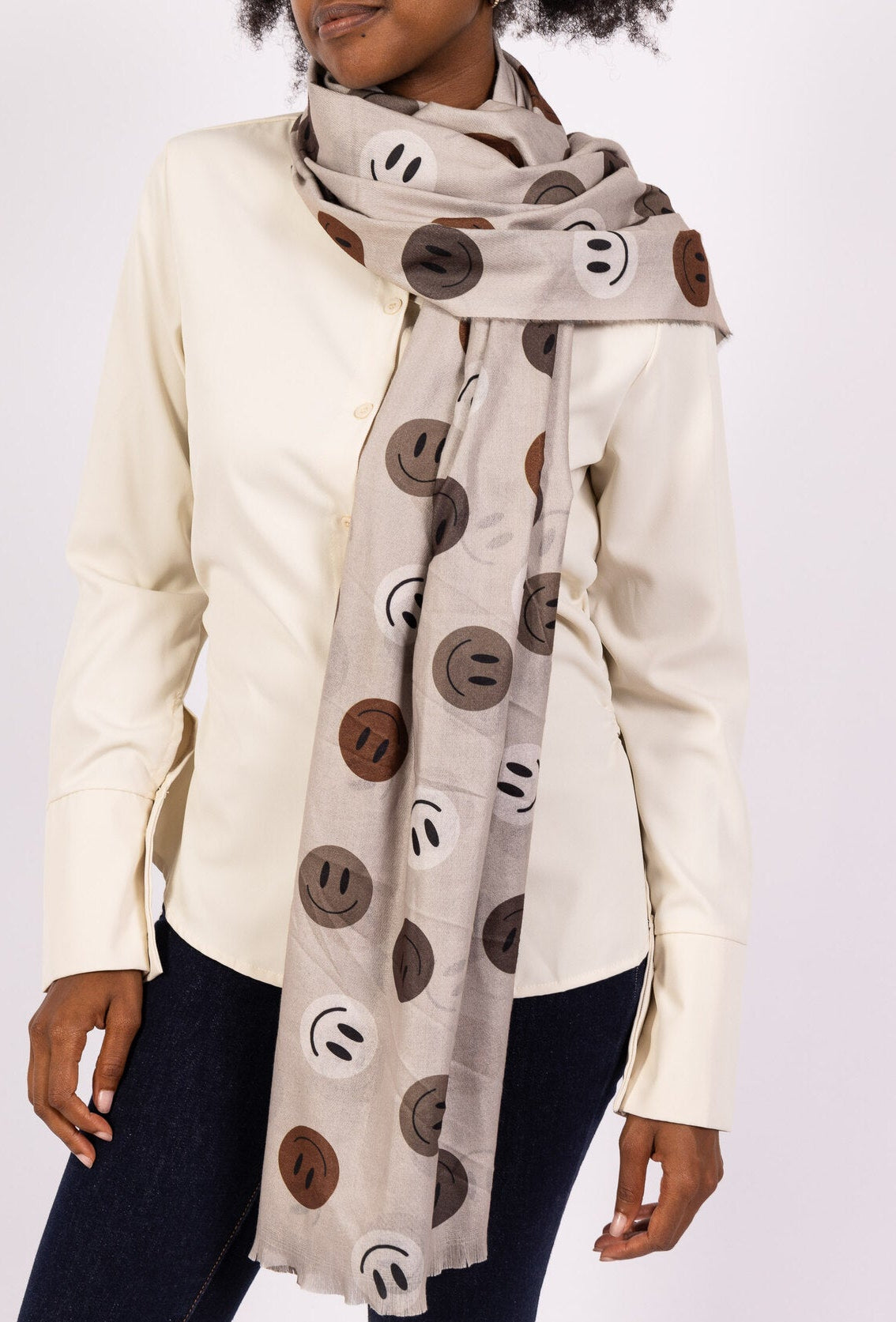 This cosy autumn scarf blends the softness of viscose with the warmth of wool, creating a comfortable accessory to brighten your winter outfits. Featuring a cheerful smiley print, it adds a playful touch to your style while keeping you warm. Its versatile design make it an easy addition to your wardrobe essentials. This scarf is the perfect mix of comfort and charm for the colder months.