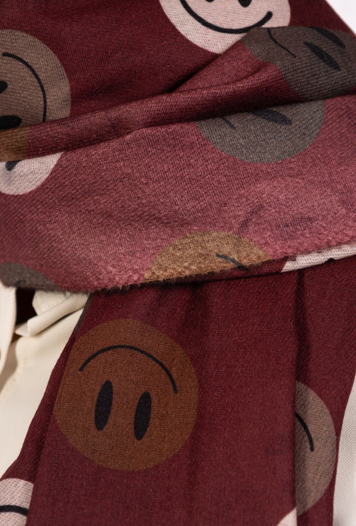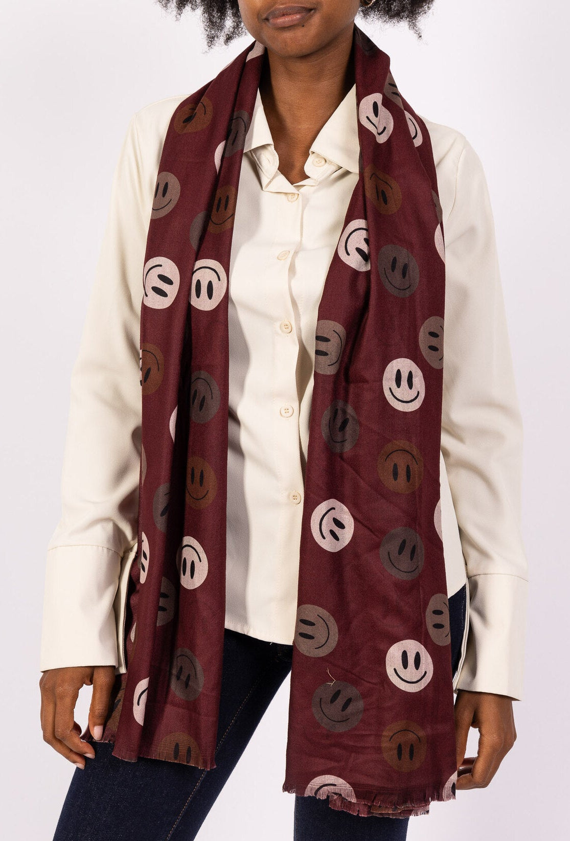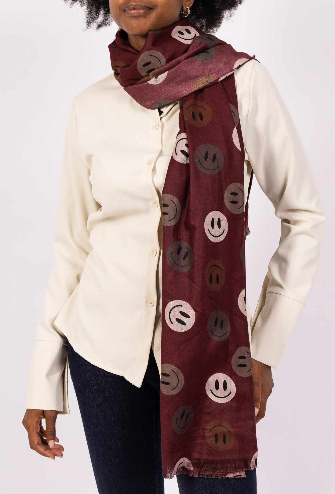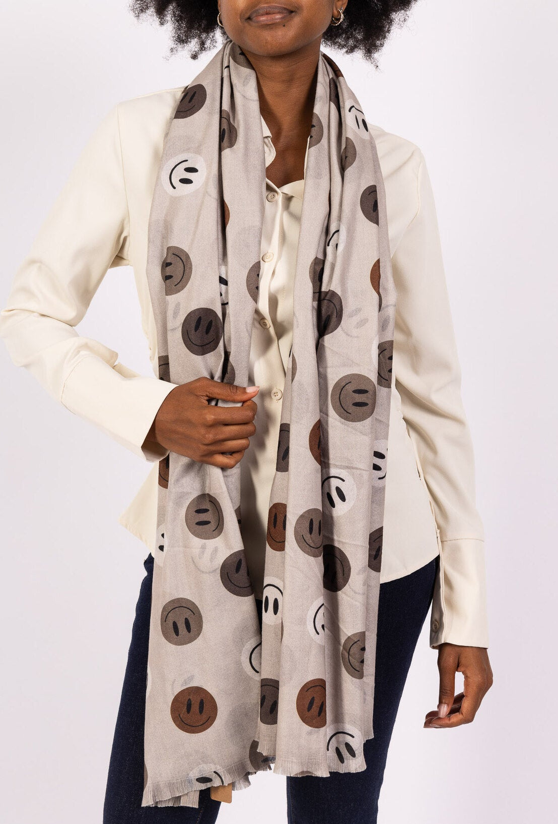 This cosy autumn scarf blends the softness of viscose with the warmth of wool, creating a comfortable accessory to brighten your winter outfits. Featuring a cheerful smiley print, it adds a playful touch to your style while keeping you warm. Its versatile design make it an easy addition to your wardrobe essentials. This scarf is the perfect mix of comfort and charm for the colder months.