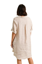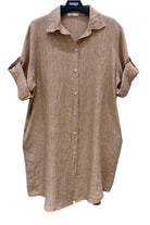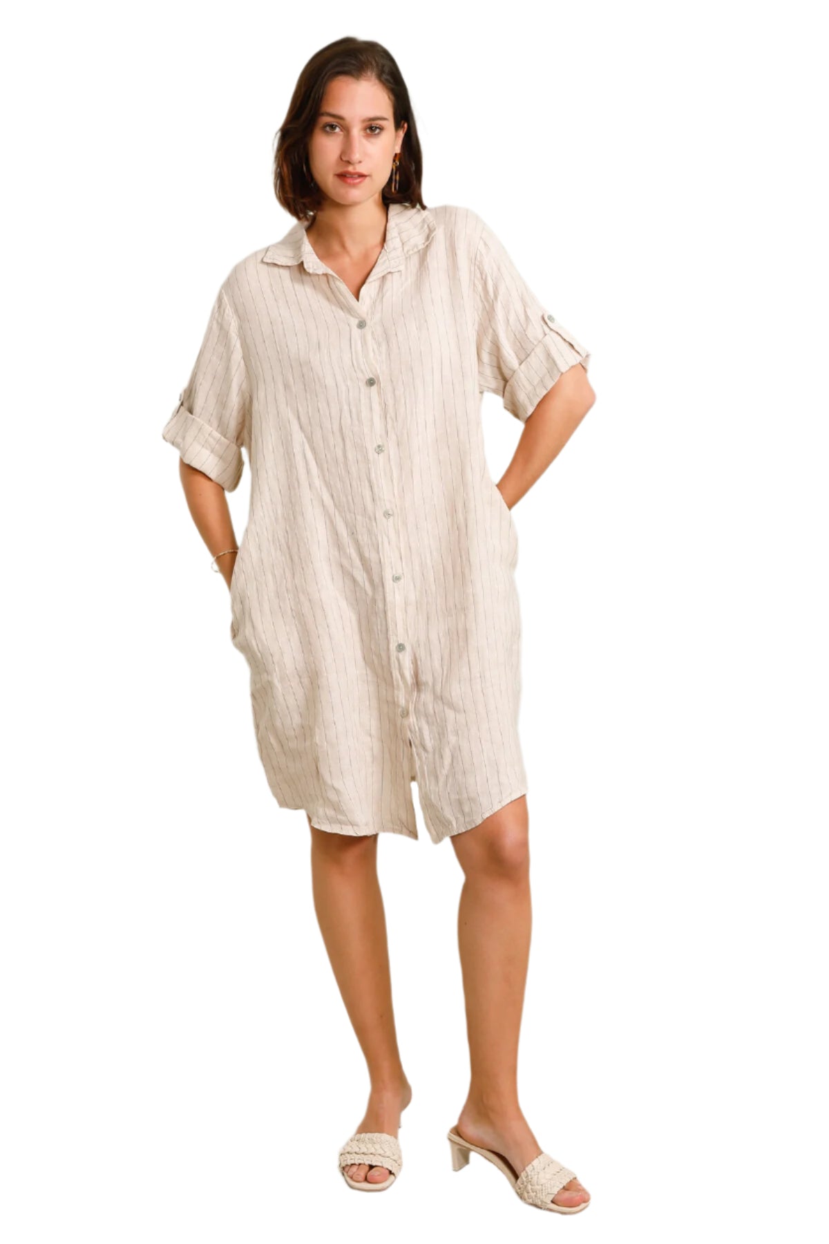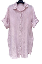 This striped linen shirt dress, crafted in Italy, offers versatile style and comfort. Made from 100% breathable linen, it can be worn as a belted dress or an overshirt, adapting effortlessly to your look. With a flattering length of 100 cm and a one size design, fitting sizes 40-44 (UK 12-16) it combines elegance and ease for any occasion.
