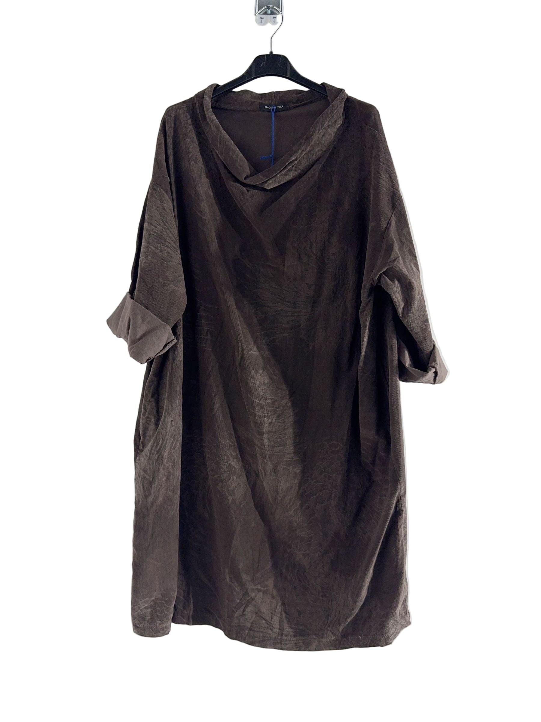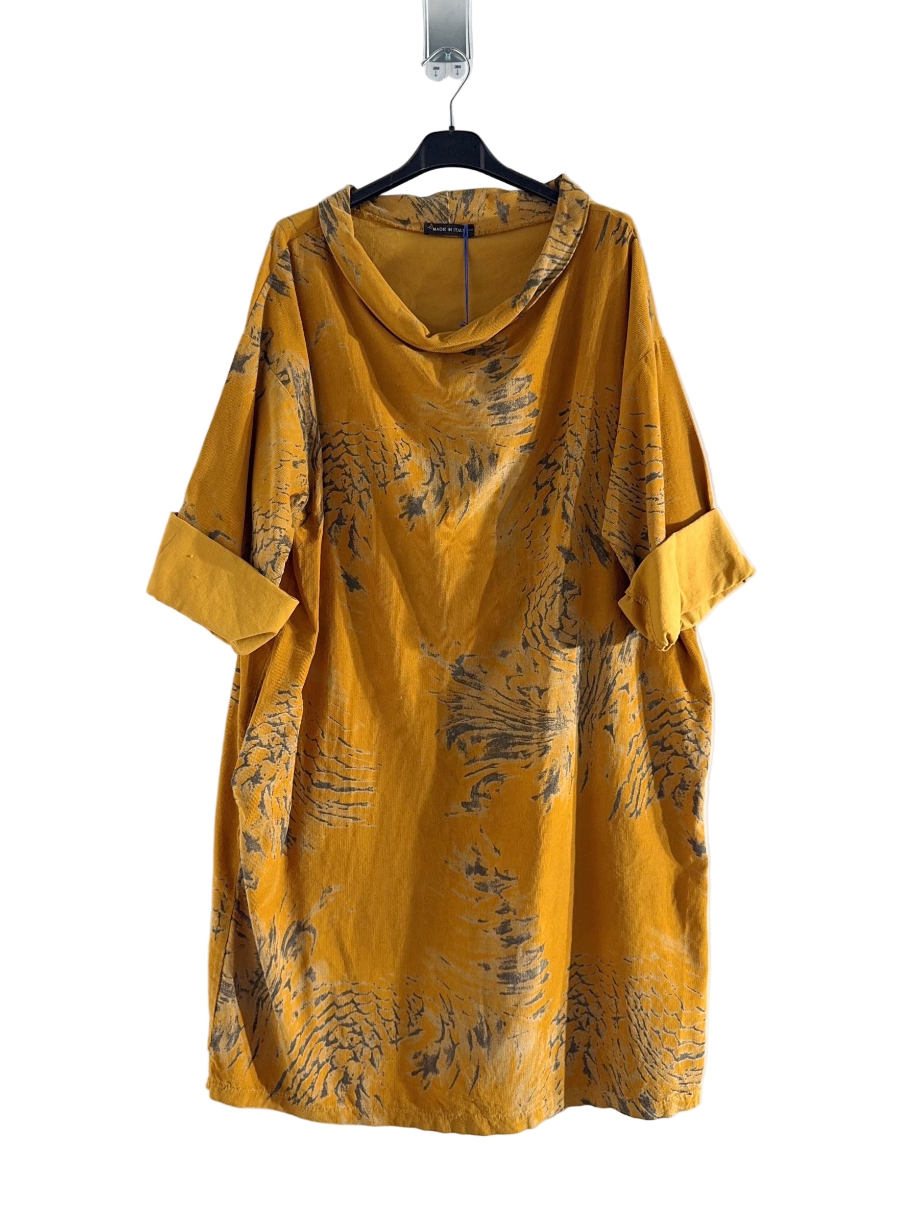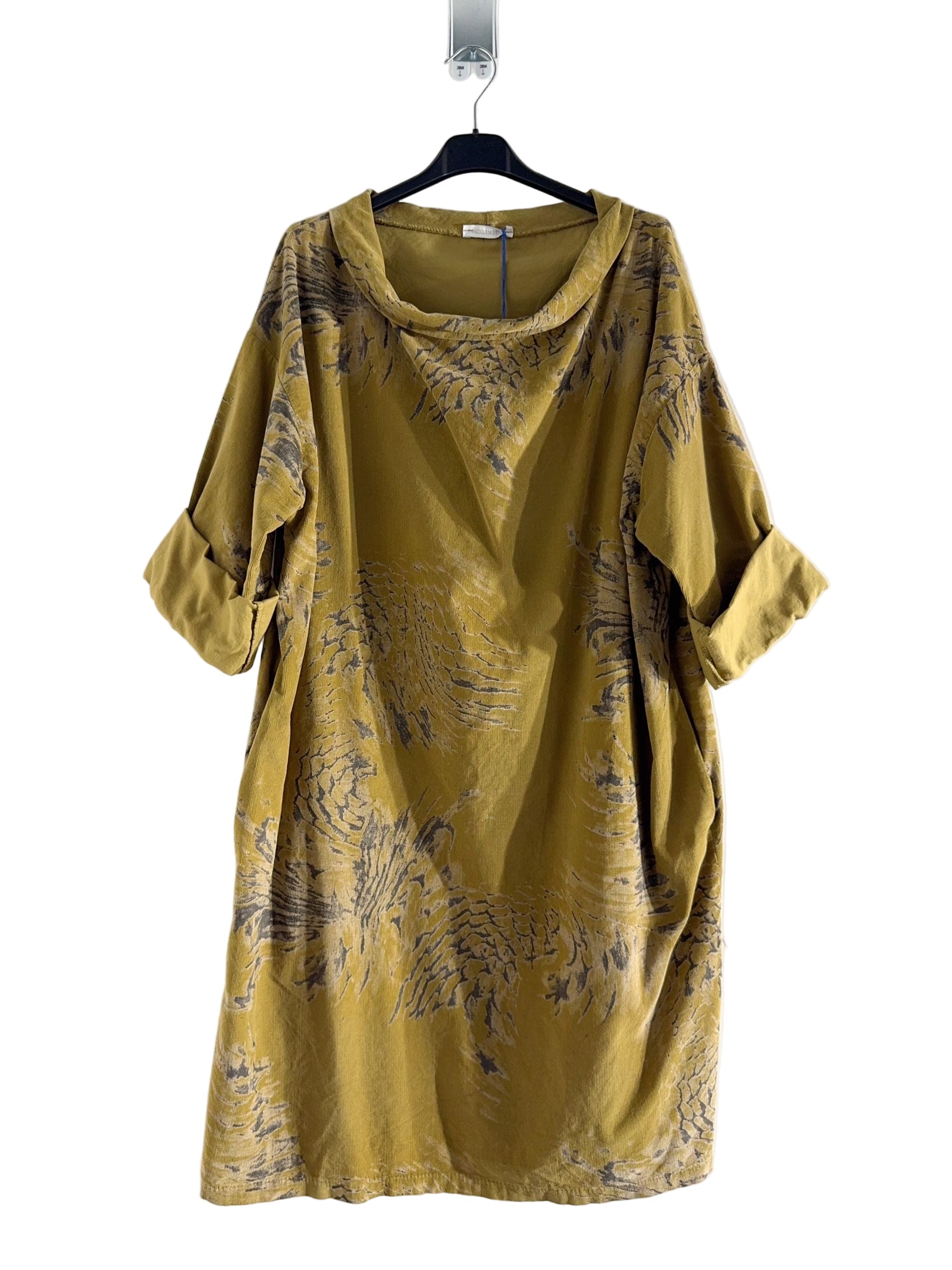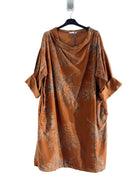 This mid-length printed corduroy dress combines comfort and style for the cooler seasons. Its soft, warm fabric keeps you cosy, while the elegant cowl neck adds a flattering, sophisticated touch. Featuring unique classic print, long sleeves and discreet side pockets, it offers both practicality and flair. The mid-length cut enhances all silhouettes, whether worn loose or belted. Available in a standard one size 40-44 (UK 12-16) this dress is the perfect choice to elevate your autumn and winter wardrobe with effortless chic.