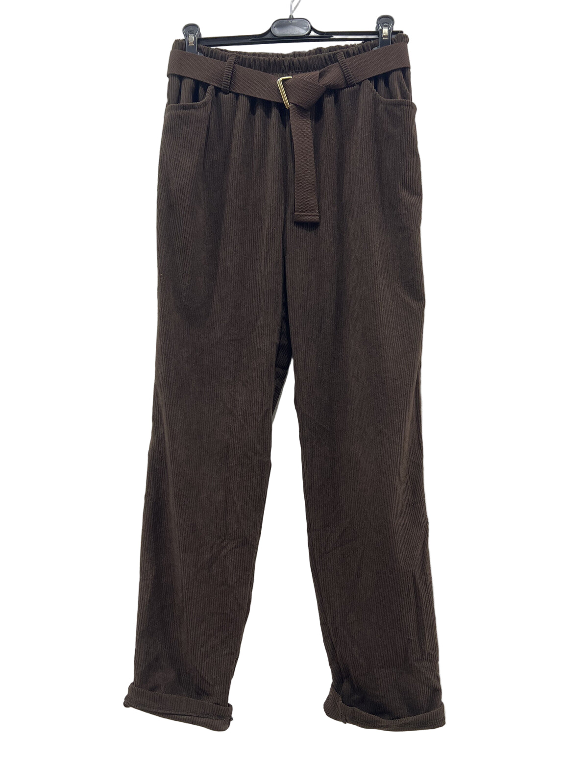 Ce pantalon côtelé italien allie style et confort pour la saison automne-hiver. Confectionné dans un mélange de viscose, polyester et élasthanne, il est doté d'une ceinture qui sublime la silhouette et s'adapte à tous les looks, décontractés comme élégants. Conçu pour les tailles 38 à 42 (10-14 UK).