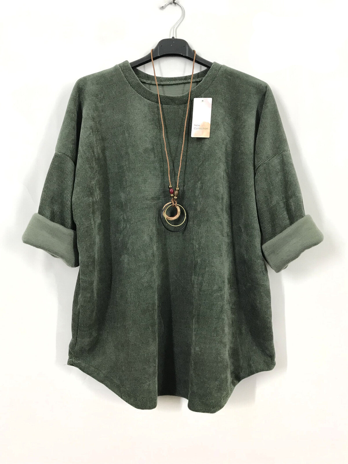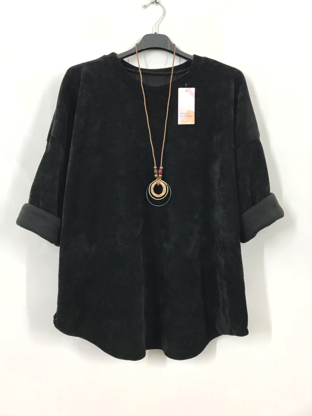 Ce top en velours est confectionné dans un tissu doux et extensible qui allie confort et élégance. Doté d'une encolure ronde et de manches longues, il se décline dans une couleur unie polyvalente. Le collier inclus apporte une touche finale charmante à votre tenue. Avec un tour de poitrine généreux de 130 cm et une longueur de 72 cm, il convient parfaitement aux tailles 40 à 48 (équivalent des tailles 40 à 48 en France). Fabriqué à partir d'un mélange d'acrylique, de viscose et de polyester, ce top allie style et résistance avec brio.