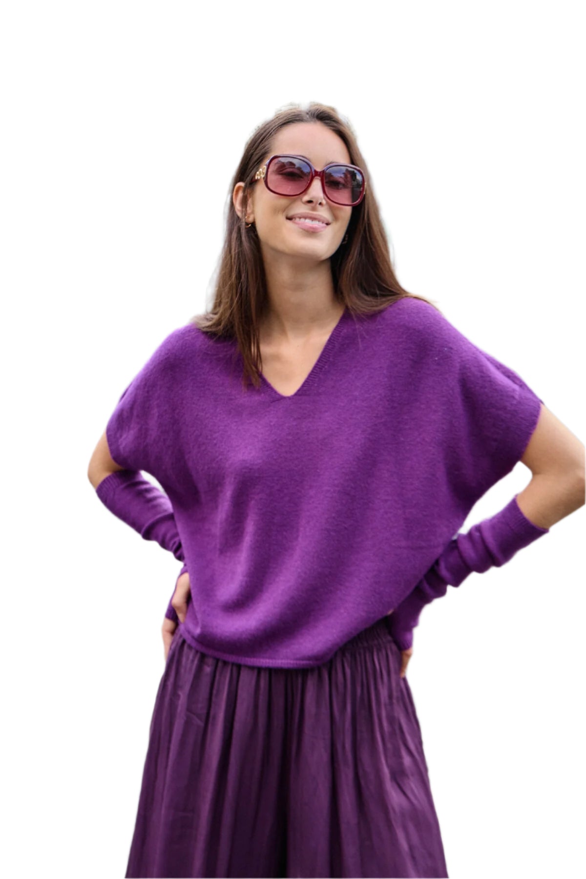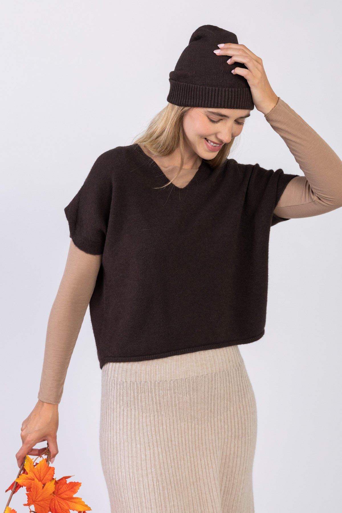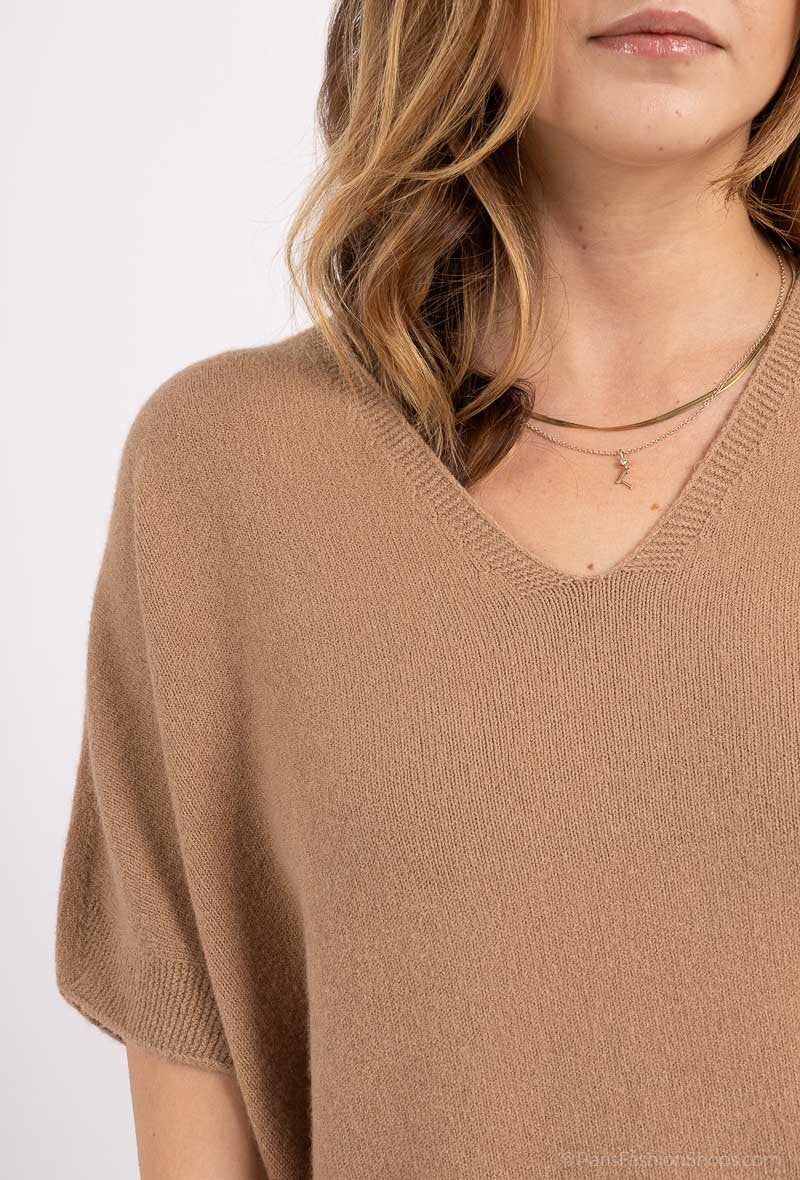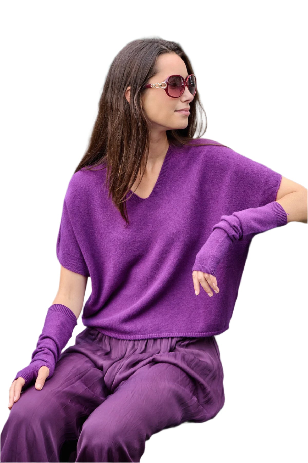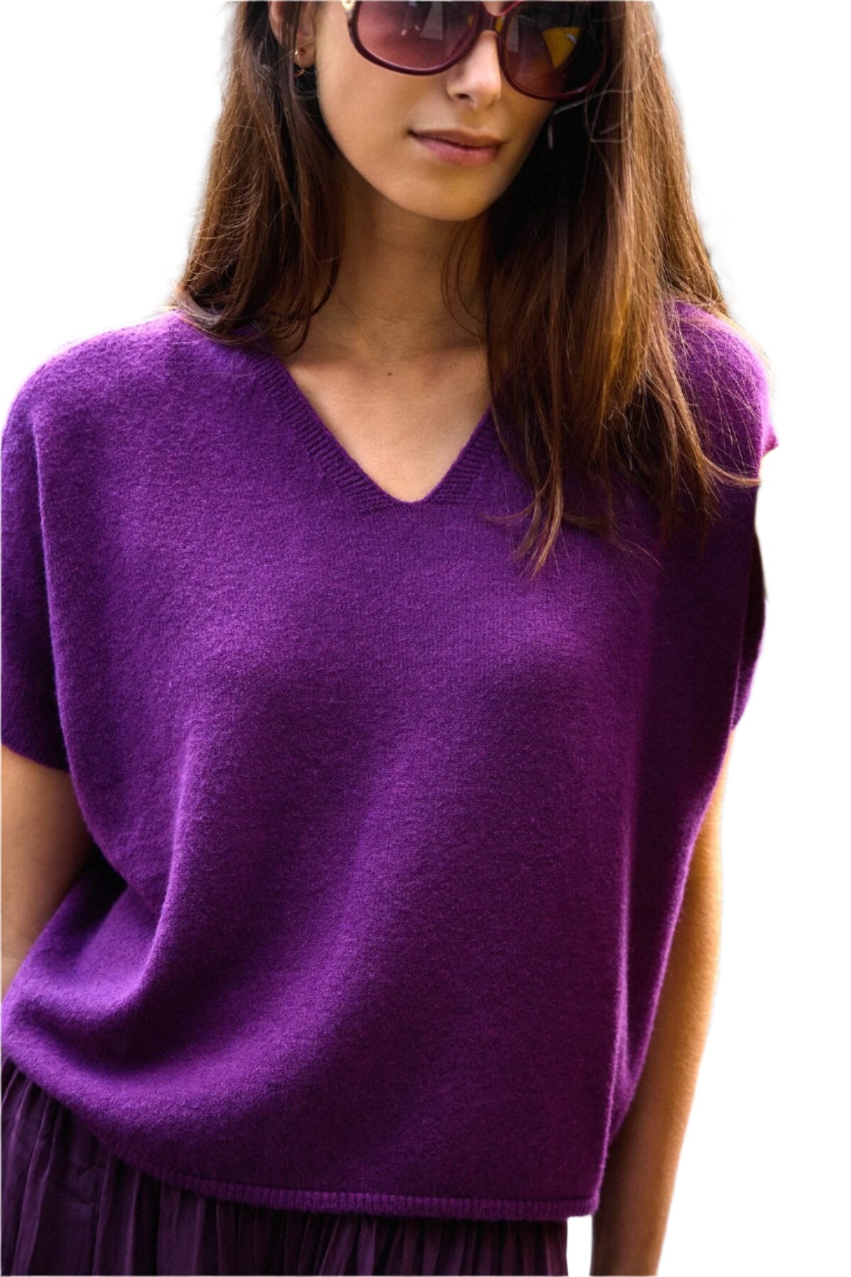 Ce pull sans coutures à manches courtes et col V offre un toucher luxueux semblable au cachemire, alliant douceur et durabilité. Fabriqué en Italie et disponible en taille unique (du 36 au 42, UK 8-14), il présente de subtiles côtes aux manches, à la taille et à l'encolure pour une finition raffinée. Parfaitement assorti à un pantalon ou une jupe, il vous invite à mélanger les textures et les couleurs pour créer des tenues élégantes et personnalisées, alliant confort et style en toute simplicité.