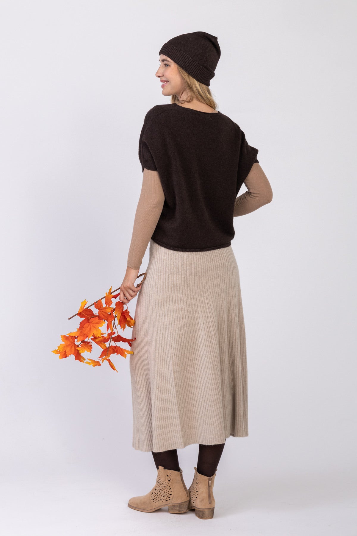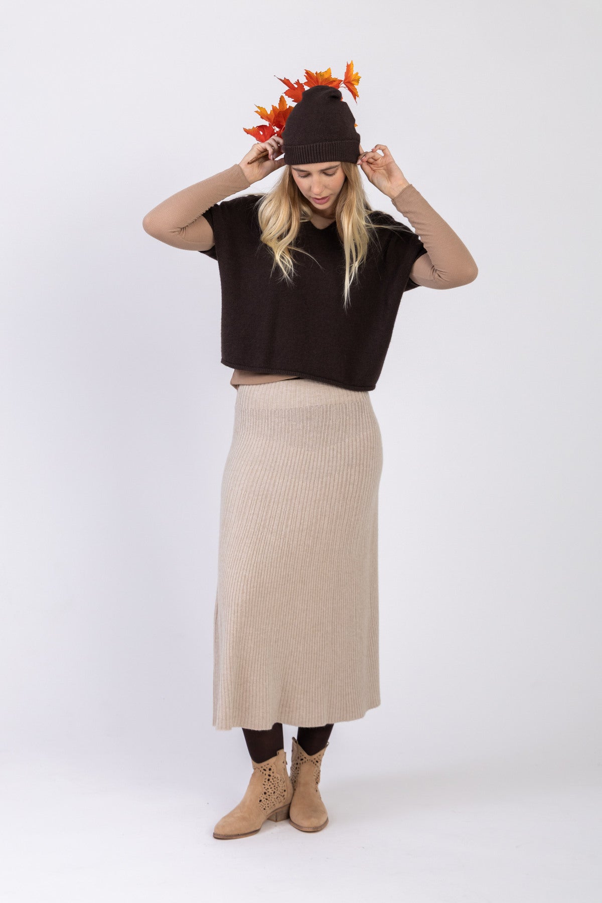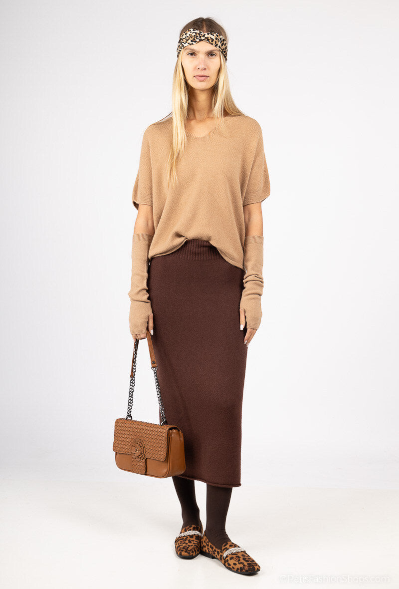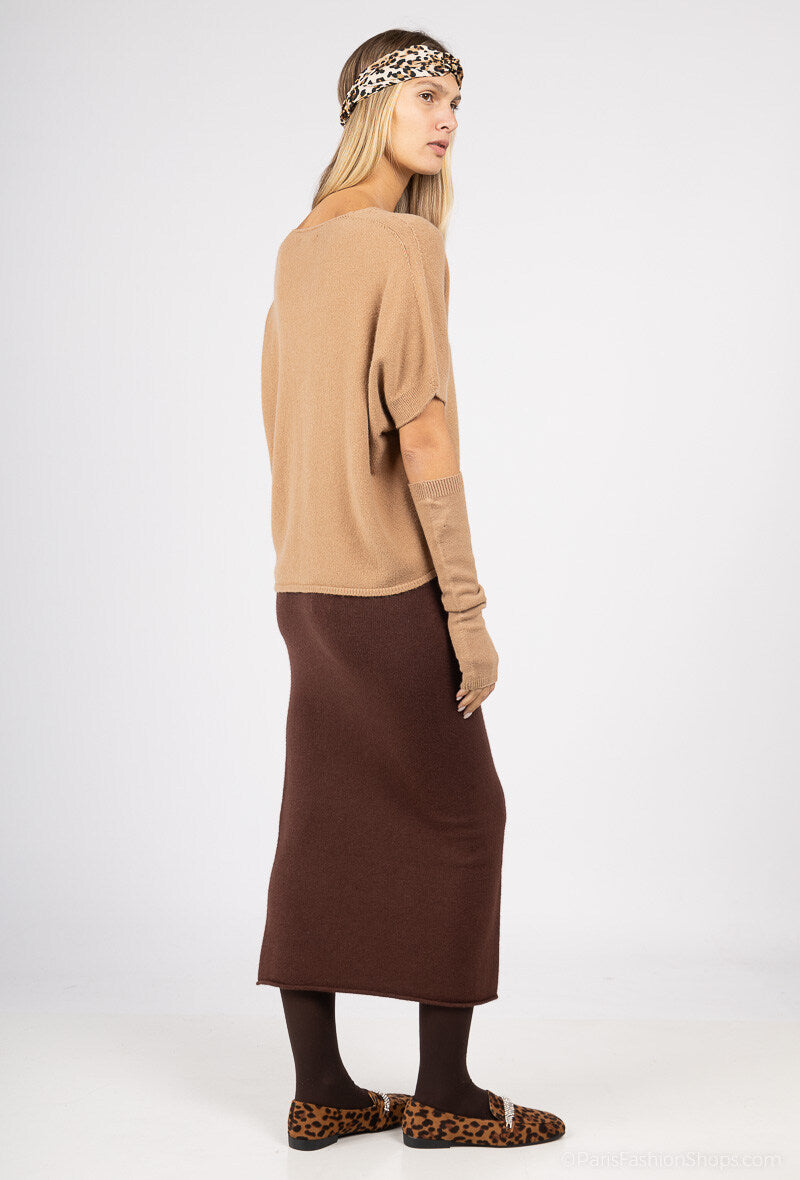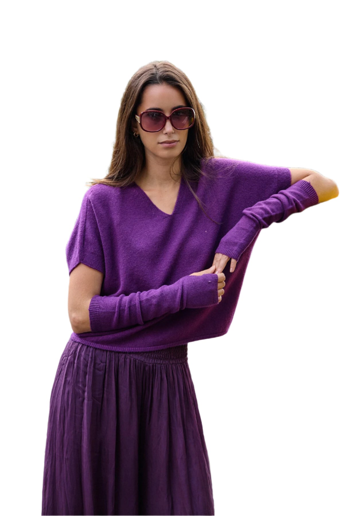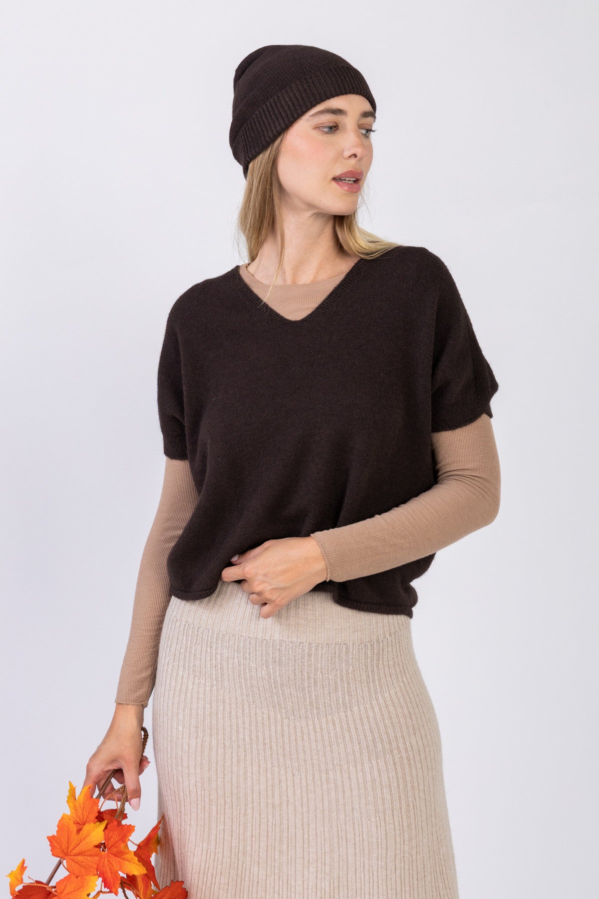 Ce pull sans coutures à manches courtes et col V offre un toucher luxueux semblable au cachemire, alliant douceur et durabilité. Fabriqué en Italie et disponible en taille unique (du 36 au 42, UK 8-14), il présente de subtiles côtes aux manches, à la taille et à l'encolure pour une finition raffinée. Parfaitement assorti à un pantalon ou une jupe, il vous invite à mélanger les textures et les couleurs pour créer des tenues élégantes et personnalisées, alliant confort et style en toute simplicité.