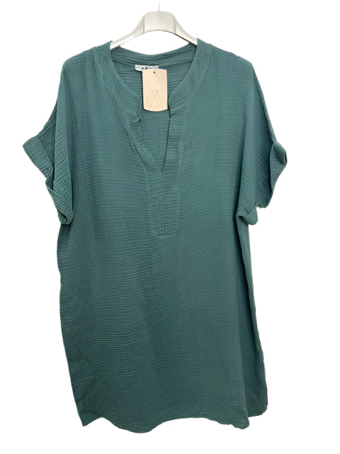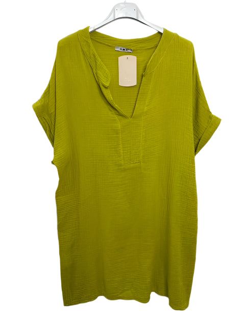 Laissez-vous séduire par le savoir-faire italien avec cette robe tunique courte et polyvalente en gaze de coton. Son col V et son col mao flattent la silhouette, tandis que son tissu 100 % coton respirant assure un confort optimal tout au long de la journée. Avec ses 93 cm de long, cette merveille taille unique convient aux tailles 38 à 44 (UK 10-16), ce qui en fait le complément idéal de votre garde-robe estivale. Fabriquée en Italie.