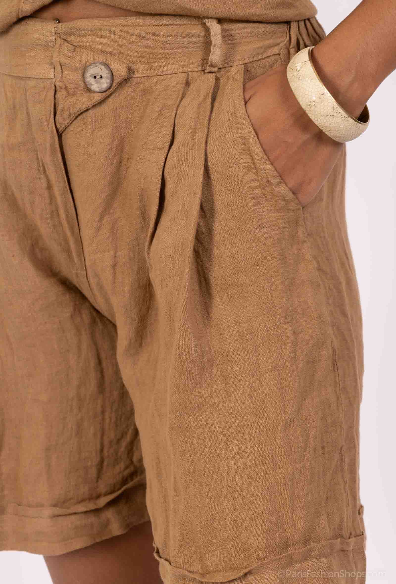 Découvrez l'alliance parfaite du confort et de la sophistication avec ce short en lin de fabrication italienne. Sa fermeture boutonnée unique sur le devant apporte une touche raffinée, tandis que sa taille élastiquée au dos assure une coupe flatteuse pour les tailles 40 à 44 (UK 12-16). Confectionné en lin respirant, ce short vous garde au frais et élégant par temps chaud, sublimant votre garde-robe d'une élégance intemporelle.